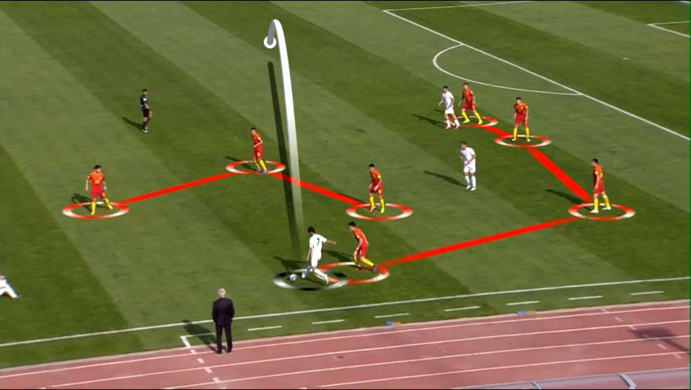 中国队:里皮强攻试探失败,上半场保守下半场意外打乱部署。 里皮排出4-3-3攻击阵型,于大宝、张玉宁、郜林三前锋同时首发,意图在客场以强撼强-25。但伊朗的高位逼抢令国足中场组织完全瘫痪,三名前锋几乎无法获得有效支援。里皮半场果断换下张稀哲与张玉宁,换上黄博文和武磊试图改变局面,但下半场开场31秒的闪电失球及吴曦受伤离场,打光了手中所有底牌-67。国足全场射正0次,控球率仅44%,与伊朗队的差距是全方位的-27。