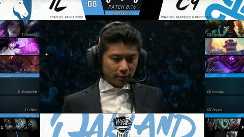 第二局,TSM试图调整战术,在前15分钟凭借Spica的积极游走稳住局势,双方经济一度胶着。然而第18分钟,C9在下路河道发起突袭,Jensen的阿兹尔用沙兵禁军之墙将TSM双C推回,C9打出0换3并顺势拿下第三条小龙。TSM的被动防守暴露了新帅体系下的沟通短板——五人在团战中的站位缺乏协同,走位犹豫、指令滞后,像一盘散沙面对C9精准的集体压上。第25分钟大龙争夺战中,Berserker再次站出,他的泽丽在大龙坑上方利用墙体完成“翻山越岭”式的进场,配合Fudge的侧翼切入,C9打出完美团战0换4,拿下大龙后经济领先来到6000。TSM的肢体语言从开场的紧张期待逐渐变为沉默的沮丧:Spica不断摇头,下路双人组在回城路上长时间盯着屏幕不语,替补席上助教双手抱胸眉头紧锁。半场结束时C9以2-0领先,手握三个赛点,冠军奖杯已近在咫尺。